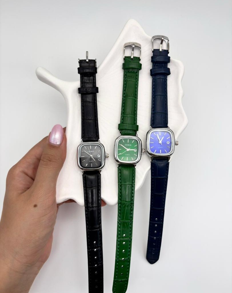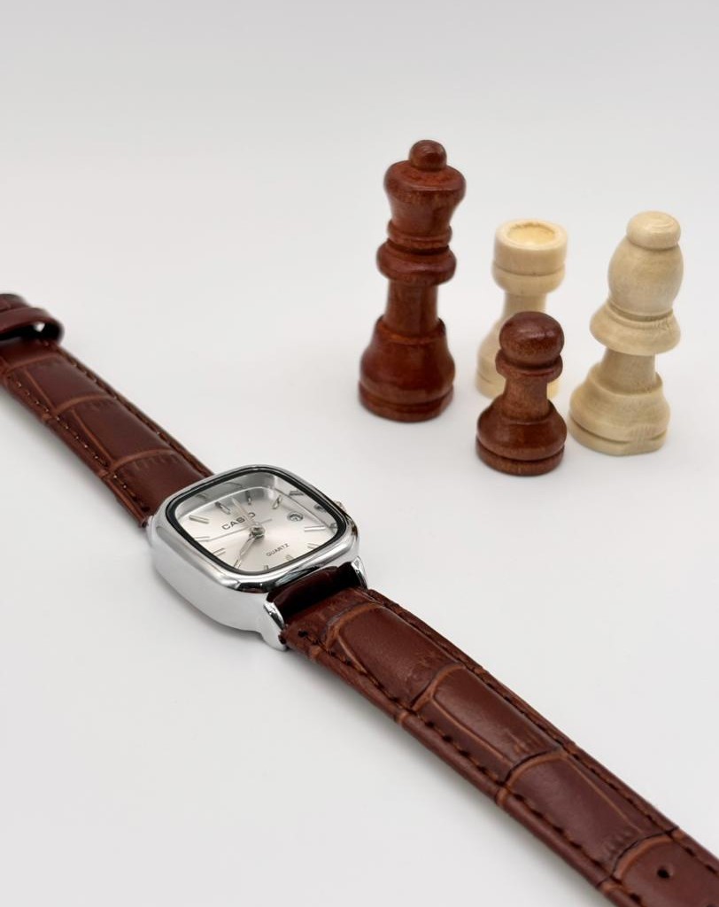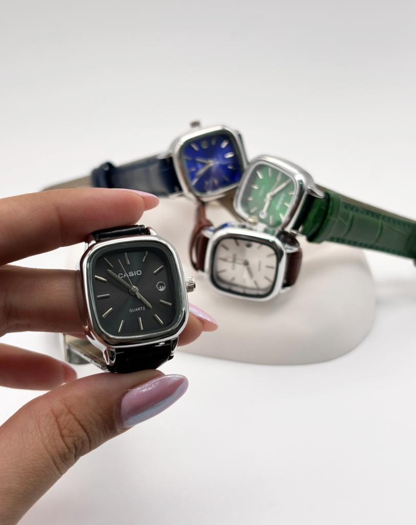 ساعت زنانه برند کاسیو با بند چرمی و صفحه مربعی، طراحی مدرن و شیک مناسب استفاده روزمره و رسمی .انتخابی جذاب برای استایلهای ساده و خاص.