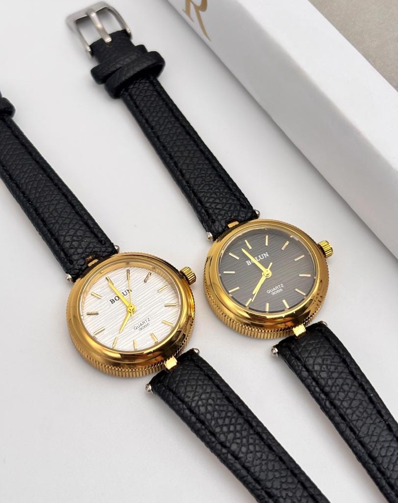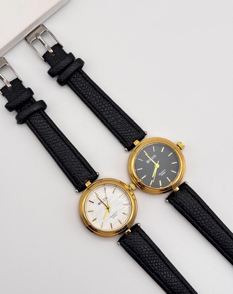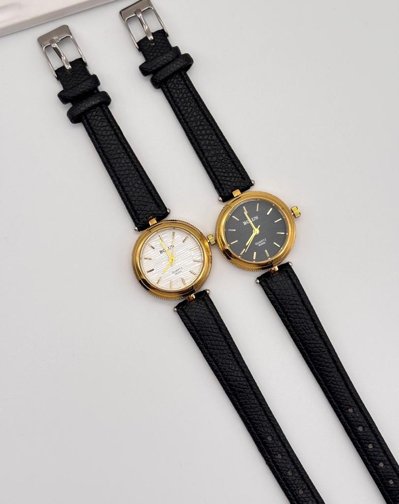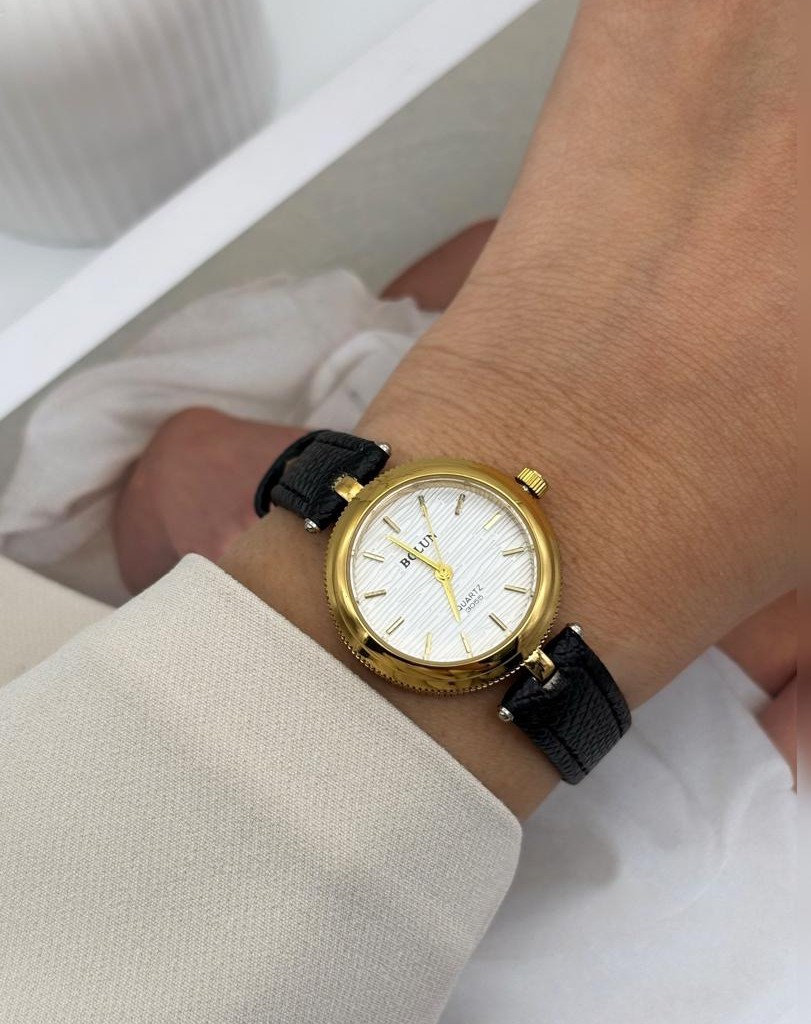ساعت مچی زنانه با بند چرمی و صفحه گرد، قاب طلایی شیک و مدرن، مناسب استفاده روزمره و مهمانی .