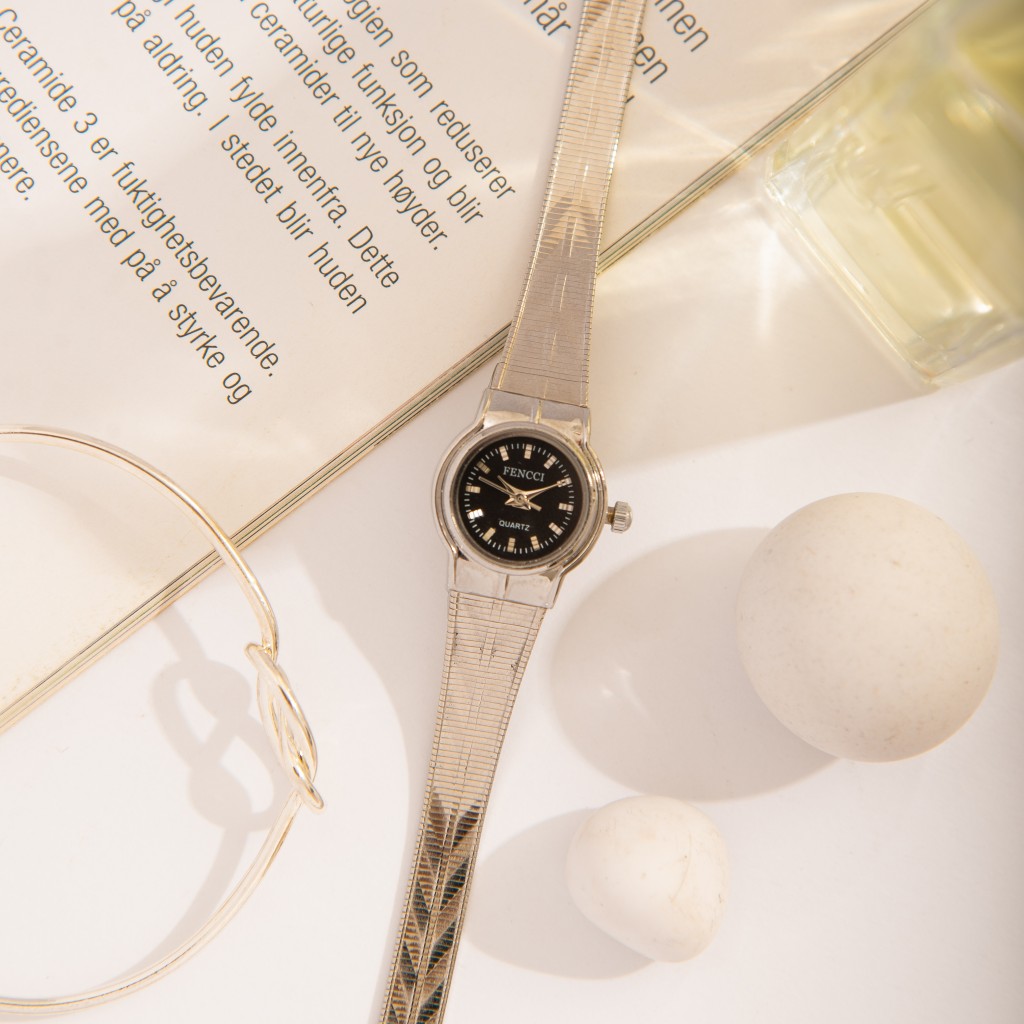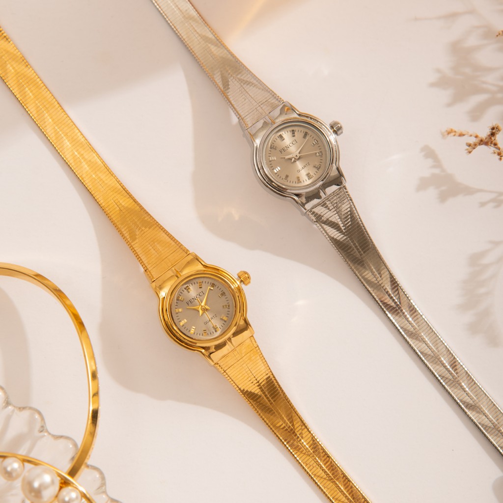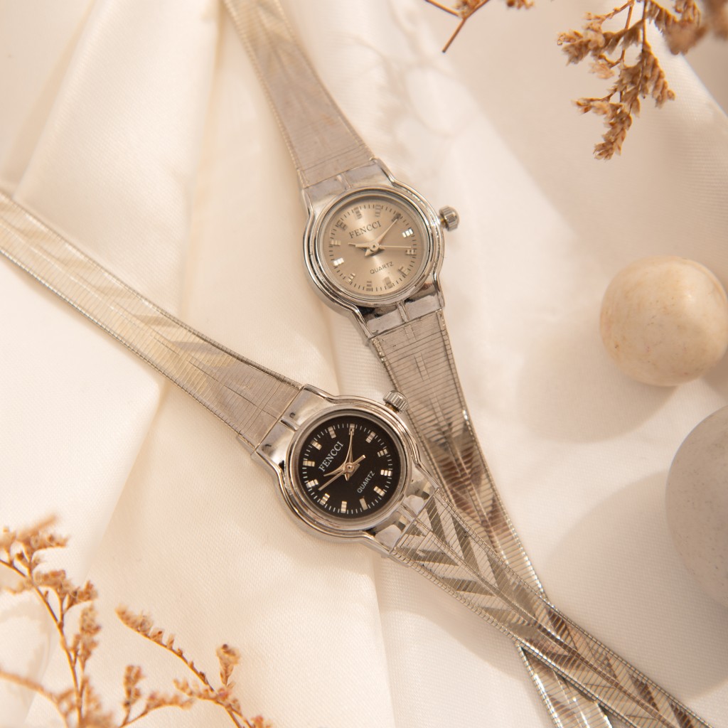 ساعت مچی زنانه فنسی با بند فلزی، ترکیبی از ظرافت و دوام. مناسب برای استفاده روزمره و مهمانیها، با طراحی مدرن و براق