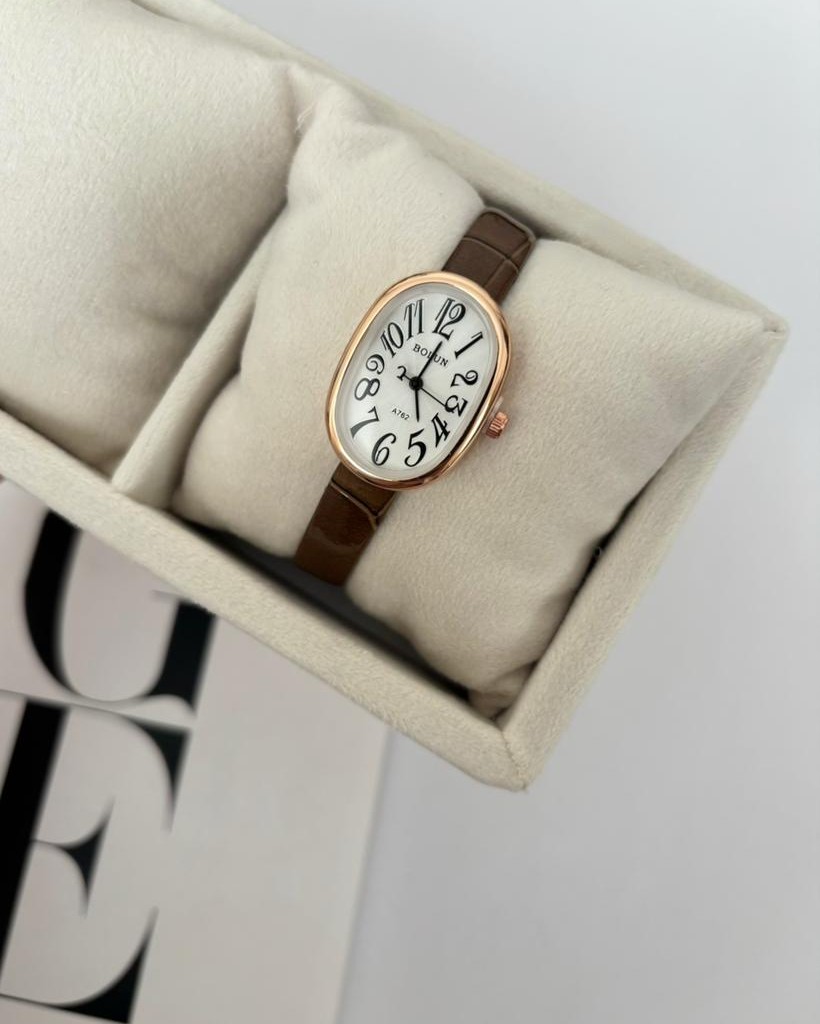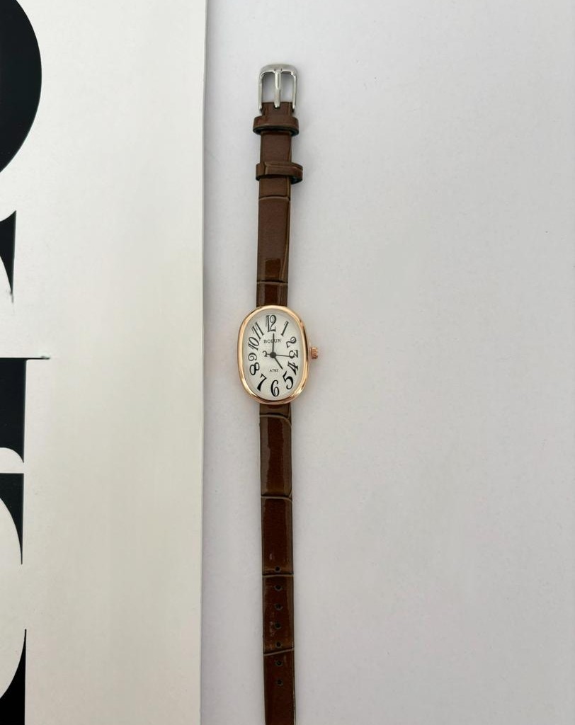 بند چرمی قهوهای با طراحی کلاسیک و صفحه بیضی، ظاهری شیک و مناسب استایل روزمره و مهمانی.