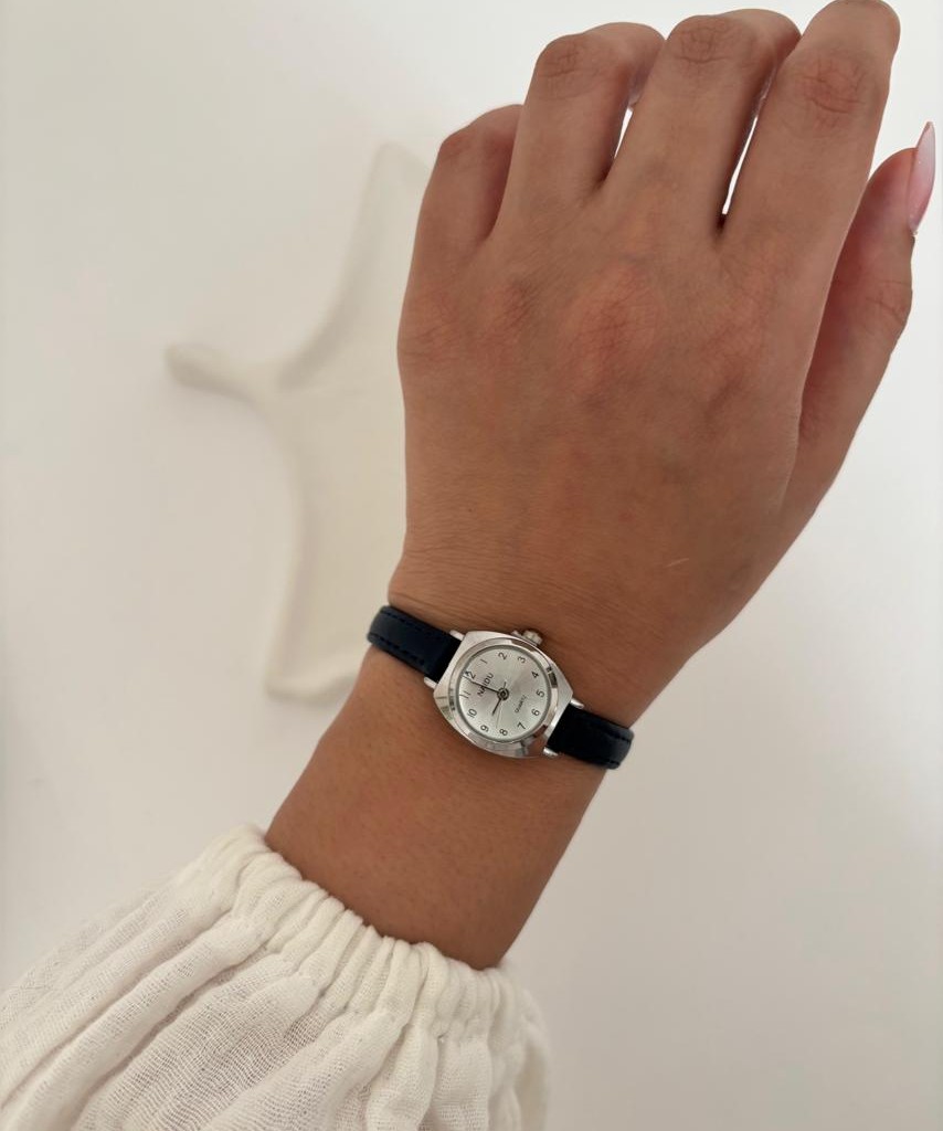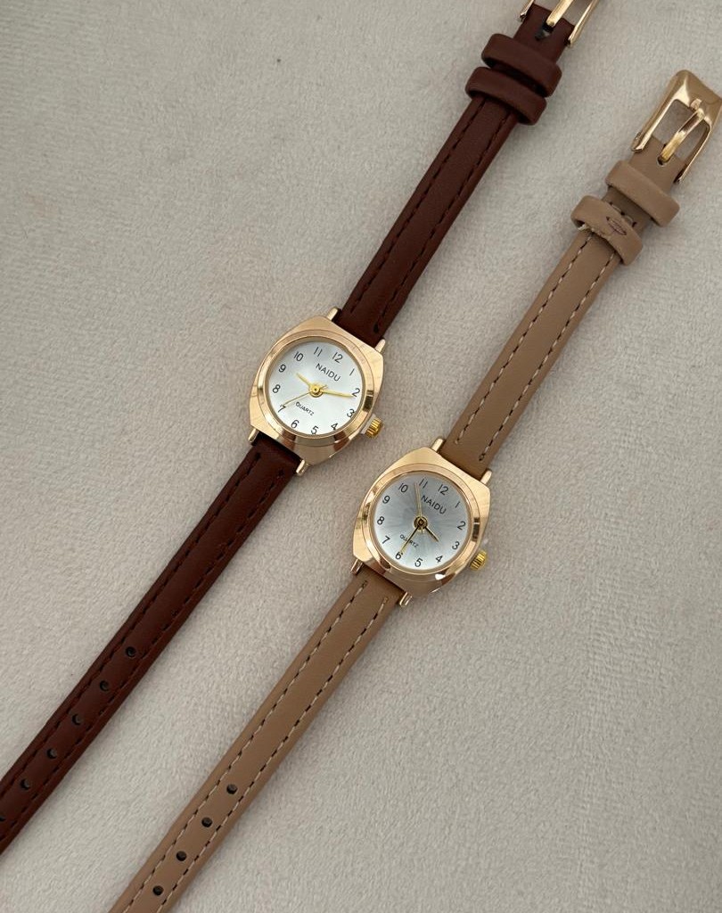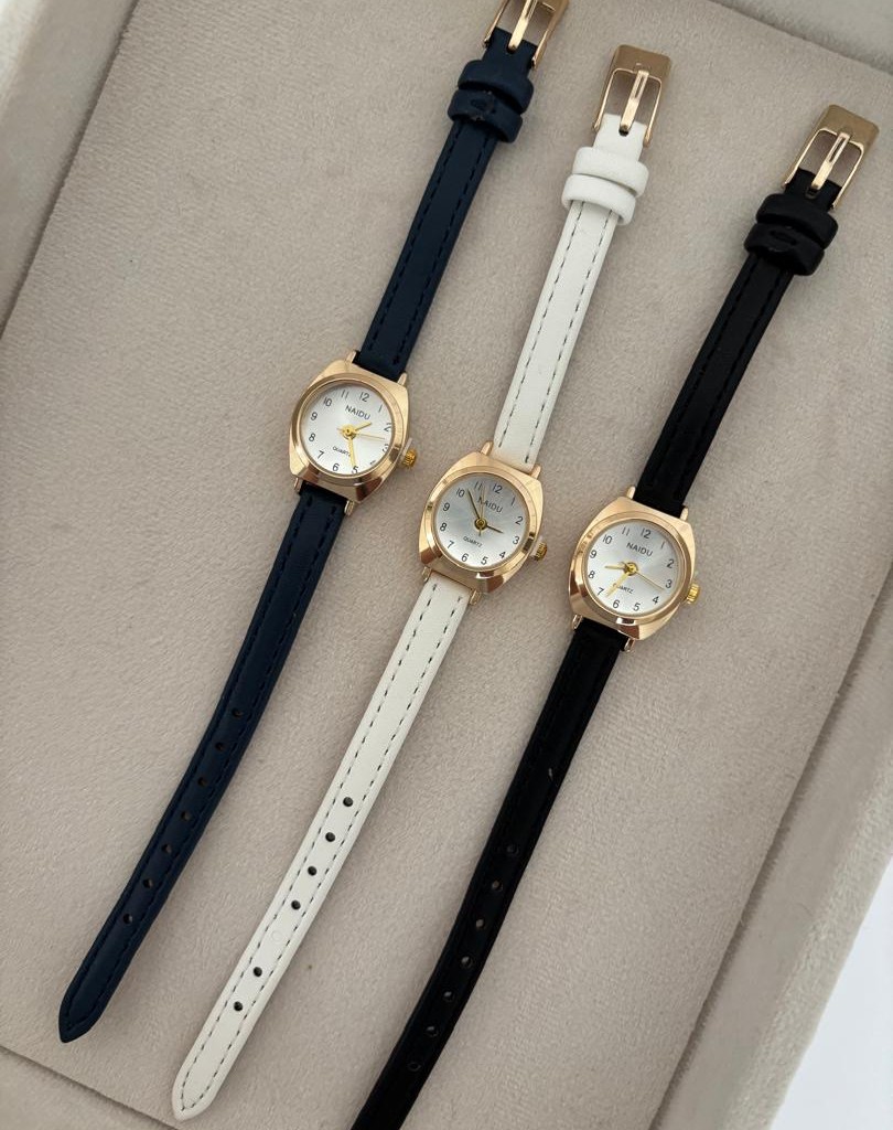 ساعت مچی زنانه با بند چرمی و صفحه گرد، طراحی شیک و مدرن با قاب ساده و جذاب، مناسب استفاده روزمره و ست کردن با استایل
