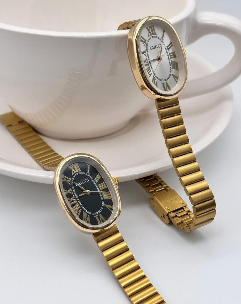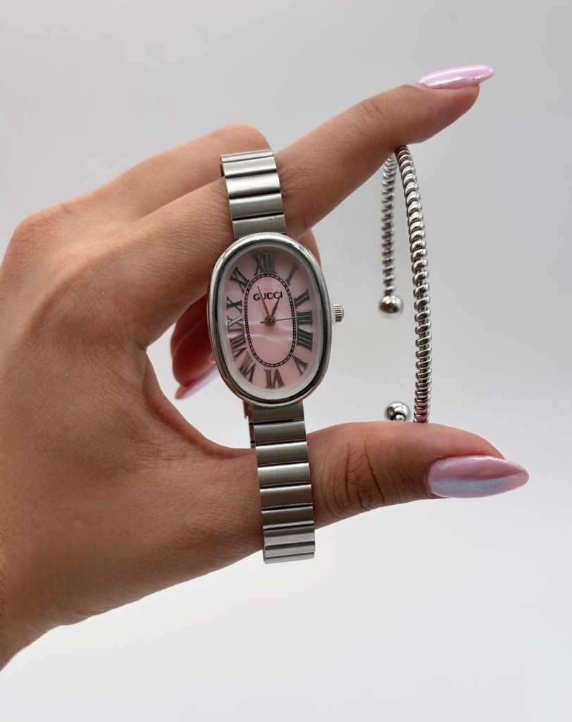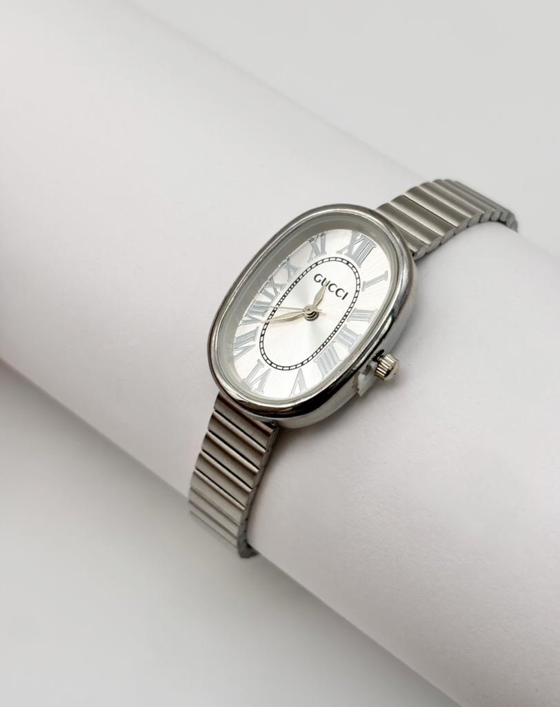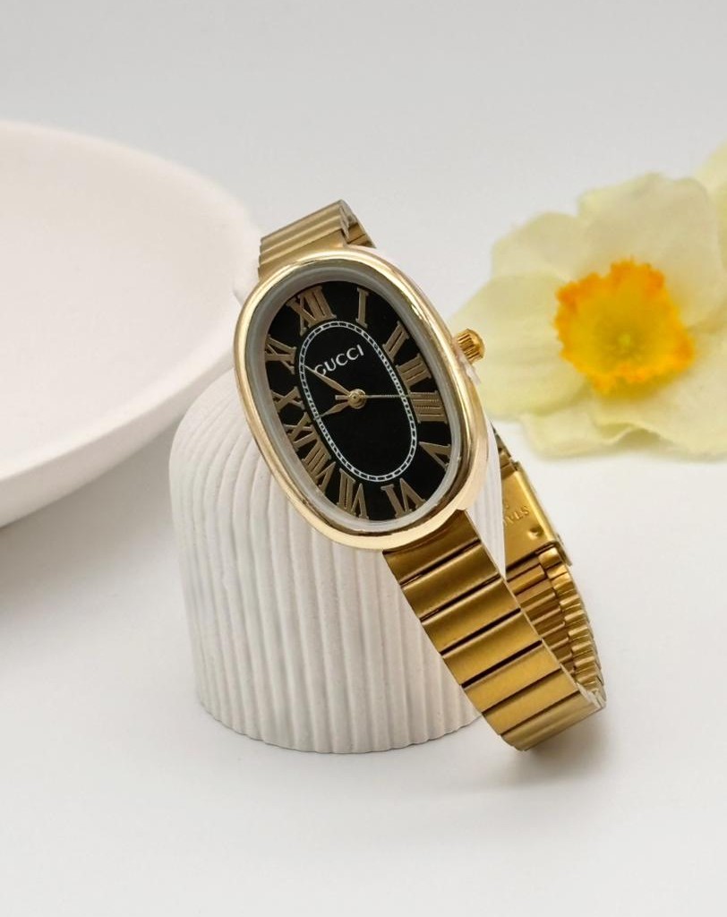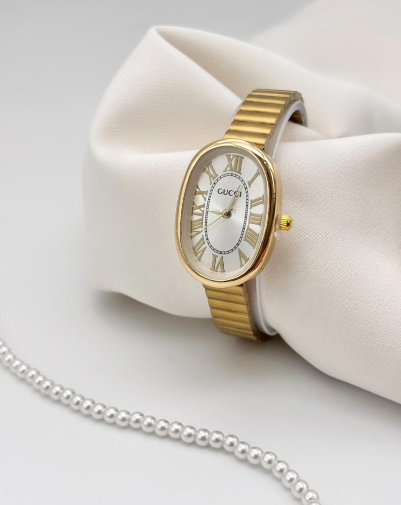 ساعت زنانه با بند استیل و صفحه بیضی، طراحی شیک و جذاب برای استفاده روزمره و مهمانی.